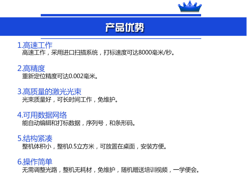 本公司提供進口激光器的服務(wù),大大方便了客戶。進口的高速振鏡掃描系統(tǒng),具有打標(biāo)精度高,加工速度快等優(yōu)點,可在流水線上打印各種文字、符號、圖案及條形碼,特別適用于硬、脆、軟產(chǎn)品。