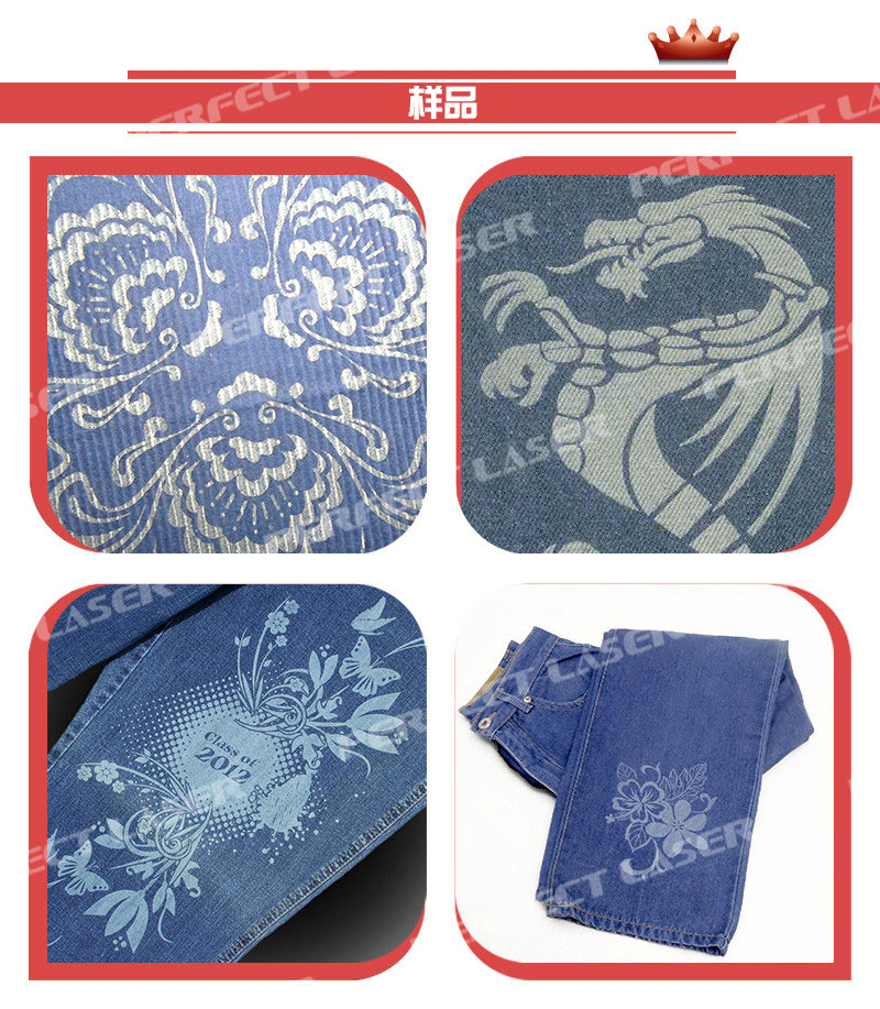 2. 牛仔布料激光雕刻機(jī)可雕刻各種個性化設(shè)計(jì)圖案:如貓的胡須,馬騮洗,PP噴霧、掛擦、撕、噴砂、雪、肖像和其他清晰的紋理效果,不褪色。