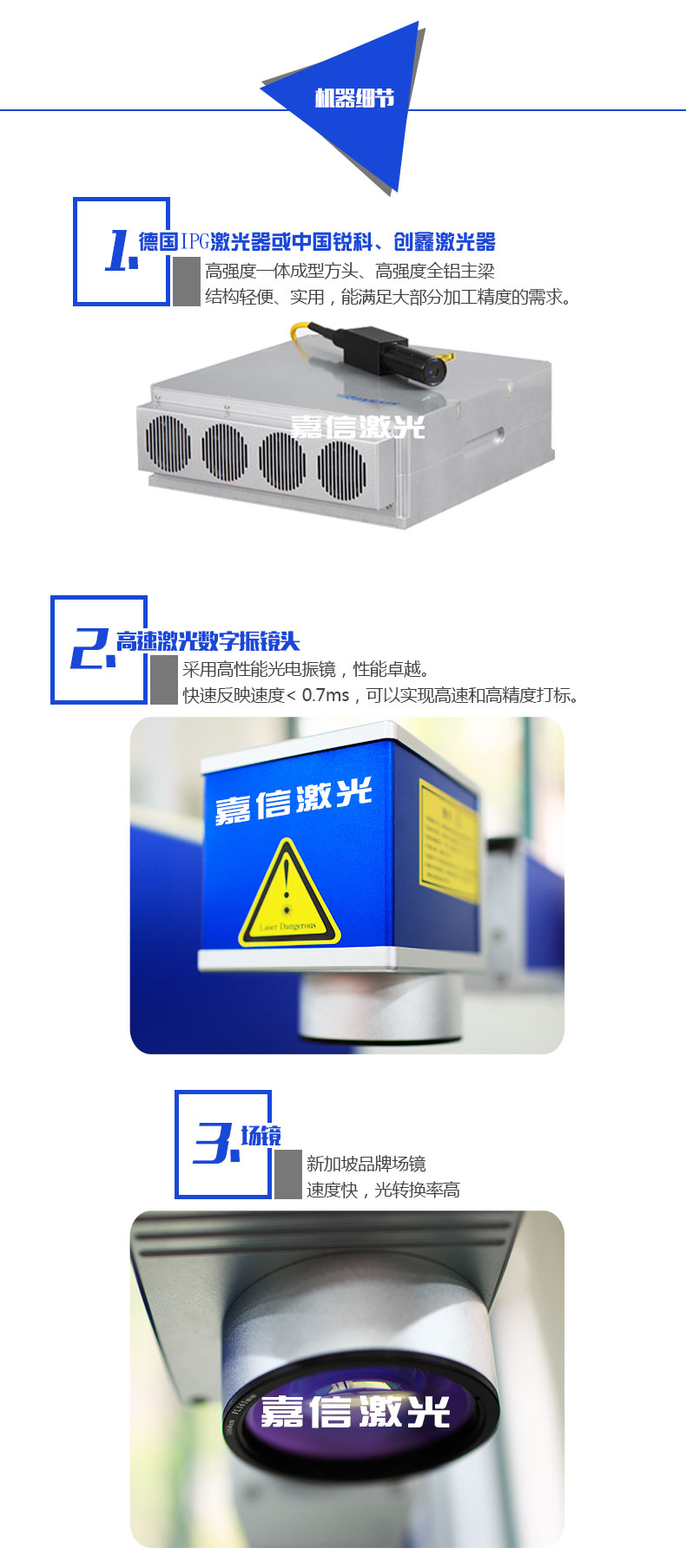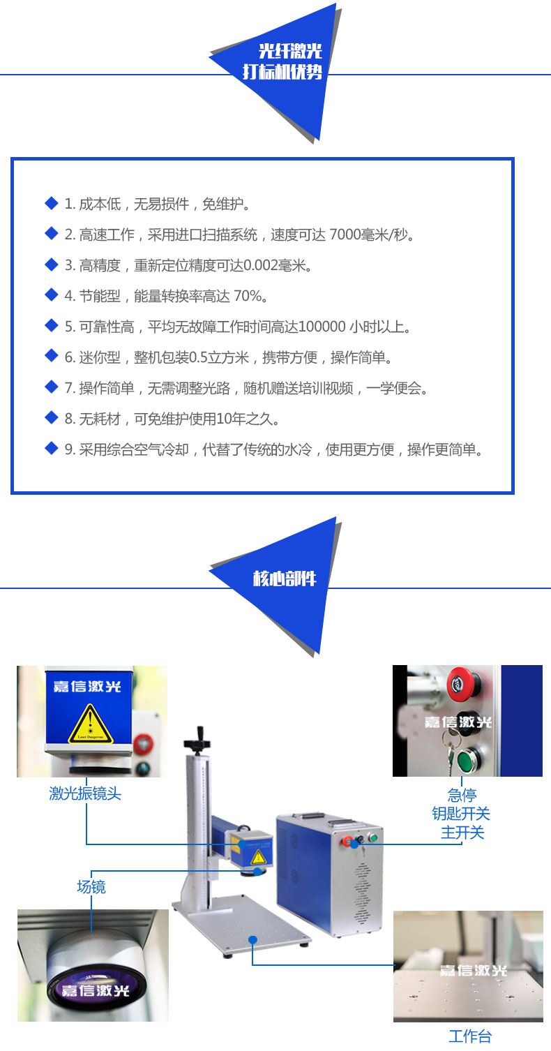 嘉信激光該款光纖激光打標(biāo)機(jī)采用精良的光纖激光器,效率高能耗低。相較于傳統(tǒng)固體激光器,光纖激光器符合友好型設(shè)計(jì)的桌面式設(shè)計(jì)結(jié)構(gòu)更為緊湊,并且可顯著增強(qiáng)輸出的光束質(zhì)量,而全光纖結(jié)構(gòu)則可提供非常堅(jiān)固可靠的封裝設(shè)計(jì)。