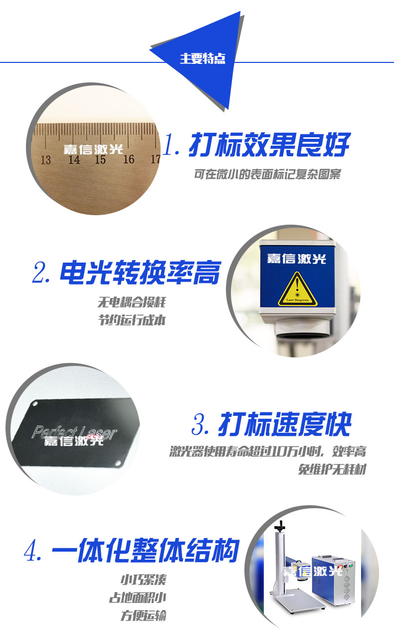 1. 高品質(zhì)進(jìn)口光纖激光器:臺(tái)式光纖激光打標(biāo)機(jī)的打標(biāo)效果精美,各種精細(xì)復(fù)雜圖案皆能利用臺(tái)式光纖激光打標(biāo)機(jī)在產(chǎn)品表面標(biāo)記出,適用于所有類(lèi)型的超精細(xì)打標(biāo);