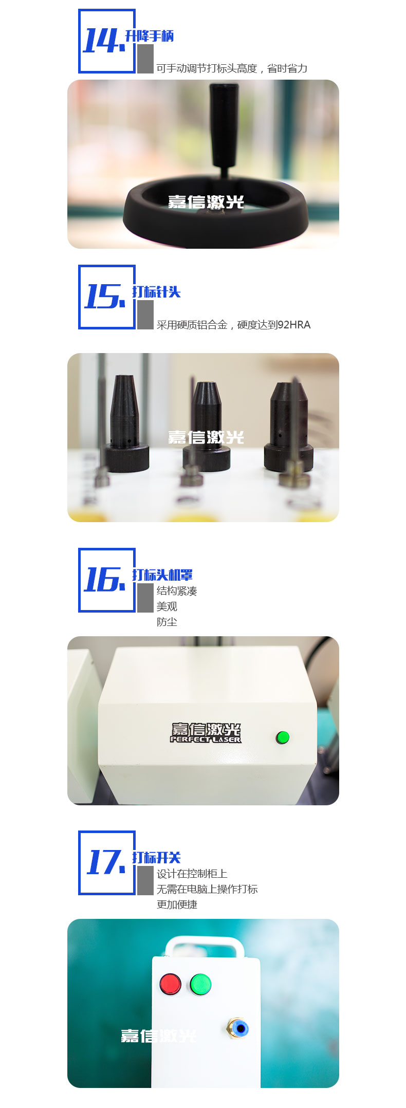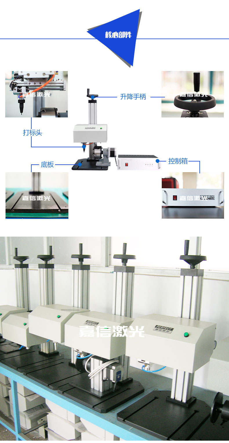 嘉信激光的旋轉(zhuǎn)氣動(dòng)打標(biāo)機(jī)同時(shí)支持平面打標(biāo)和旋轉(zhuǎn)打標(biāo)。旋轉(zhuǎn)氣動(dòng)打標(biāo)機(jī)可以使工件上的標(biāo)志,字符,字母,VIN碼,序列號(hào),日期和圖形長久性存在,不可擦除,也可用于金屬和一些硬質(zhì)塑料的標(biāo)記。