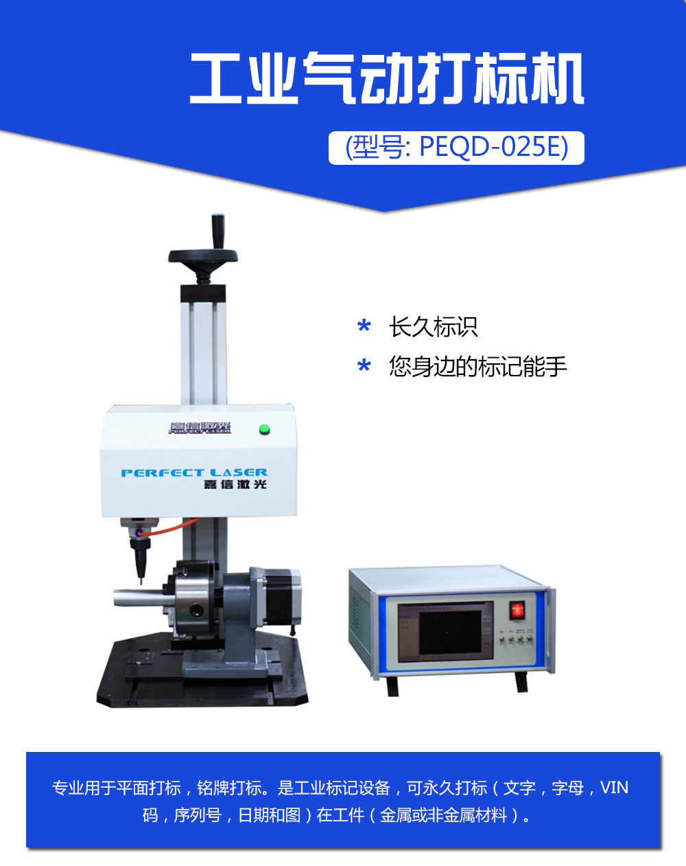 旋轉氣動打標機適合于各種金屬或非金屬標牌、零部件的平面打標、及圓柱形工件的軸向打標。用于汽車,摩托車,機械,航空,電氣設備上的各種金屬和硬塑料上的標記,例如:不銹鋼,低碳鋼,鐵,鋁,銅,黃銅,及一些涂層材料。