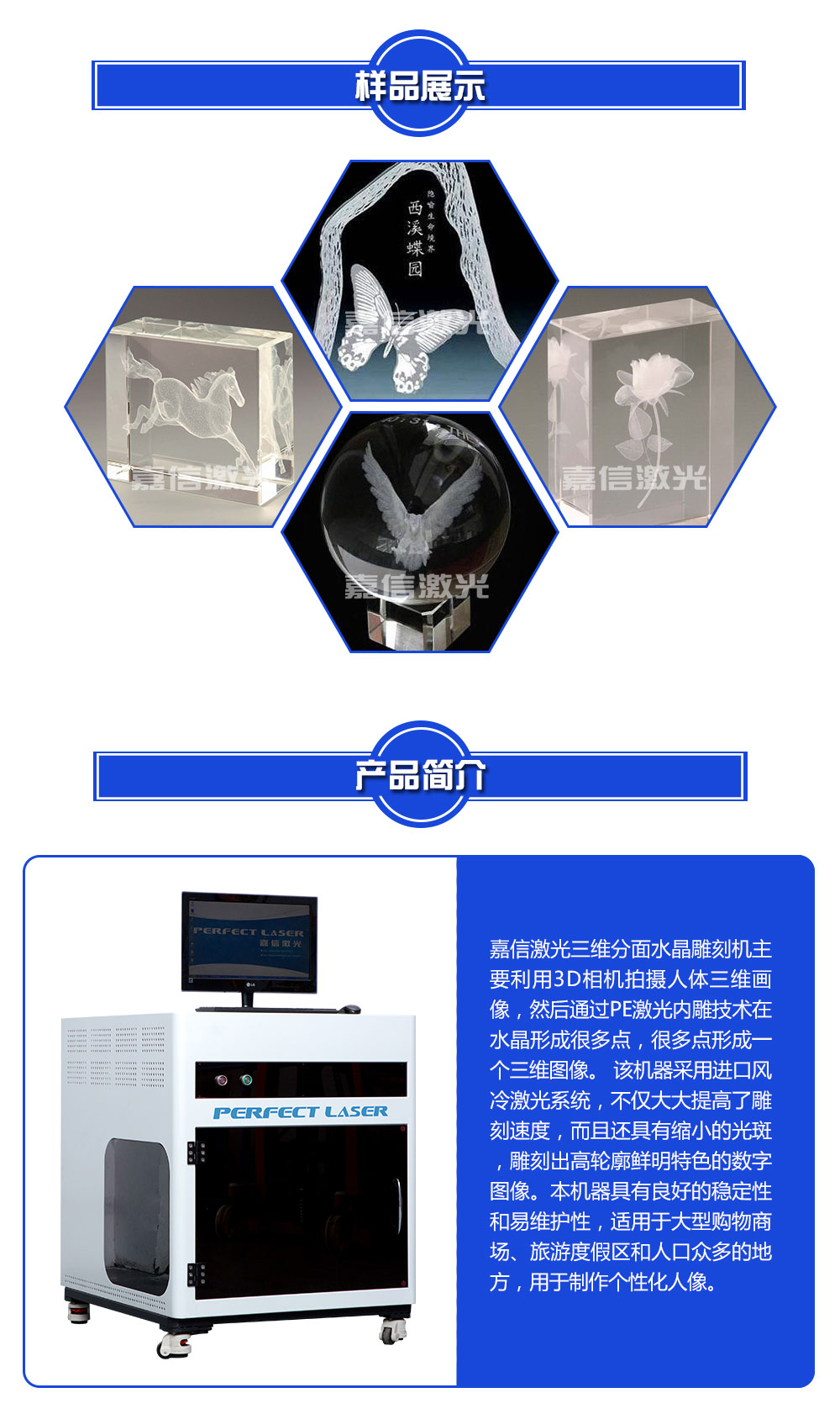 嘉信激光PE-DP-C系列工藝品水晶3D內雕機采用進口激光器材,公司設計的控制系統,將立體三維圖案雕刻在水晶玻璃亞克力等透明材料內部,雕刻效果精美,成像細膩均勻,標記持久,無粉塵無污染,支持DXF,ASC,BMP等格式。