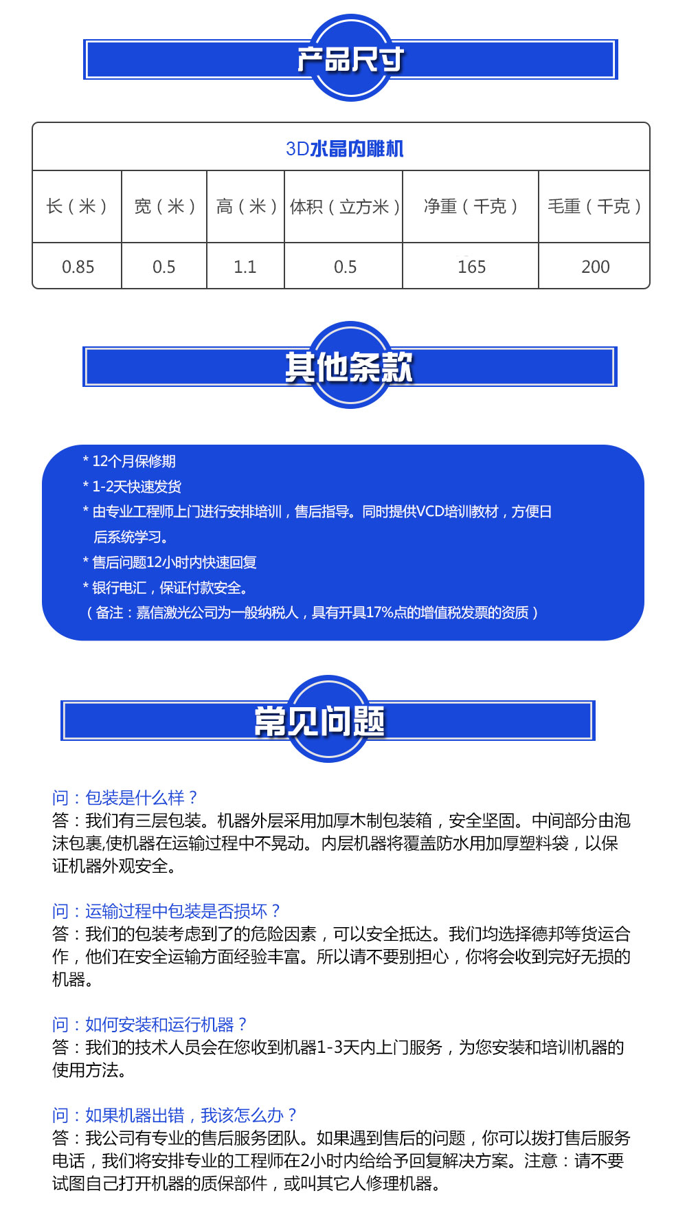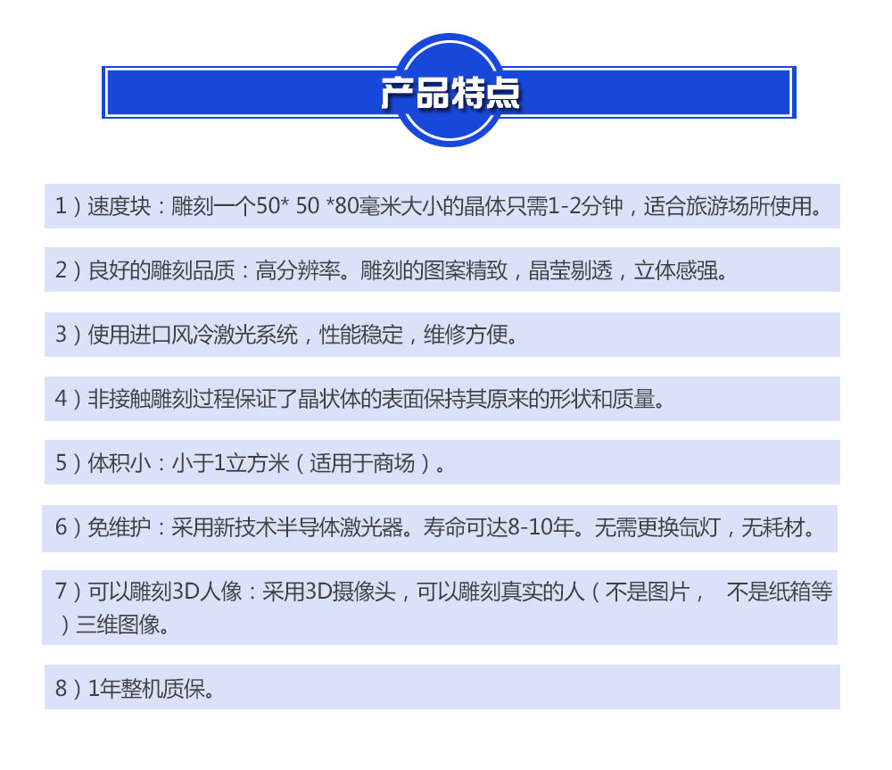 2. 成像細膩精美:工藝品水晶3D內雕機采用非接觸式的加工方式,不破壞了水晶體材料表面的光潔,特殊設計的高功率二極管泵浦器,大大提高了激光雕刻質量。